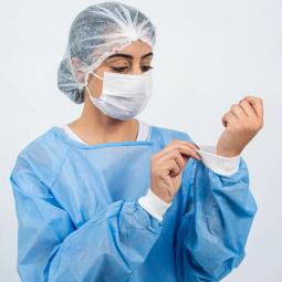 Avental confeccionado em TNT (tecido não tecido), 100% polipropileno, uso único, não estéril, protege o corpo do profissional de saúde ou do paciente contra possíveis contaminações por líquidos corpóreos ou substâncias contaminantes.