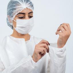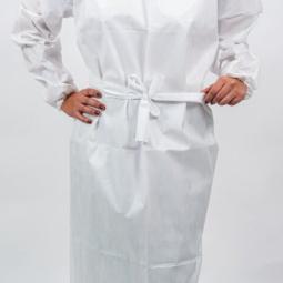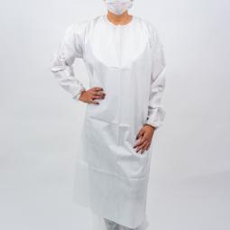 Avental confeccionado em TNT (tecido não tecido), 100% polipropileno, uso único, não estéril, protege o corpo do profissional de saúde ou do paciente contra possíveis contaminações por líquidos corpóreos ou substâncias contaminantes.