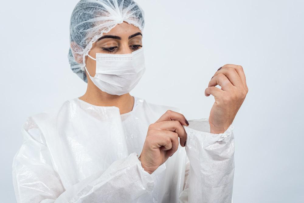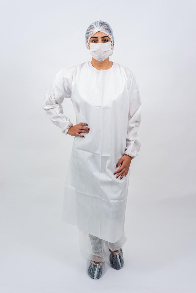 Avental confeccionado em TNT (tecido não tecido), 100% polipropileno, uso único, não estéril, protege o corpo do profissional de saúde ou do paciente contra possíveis contaminações por líquidos corpóreos ou substâncias contaminantes.