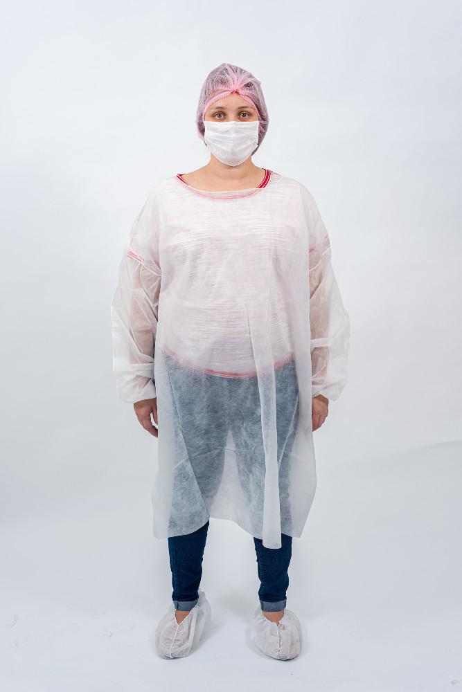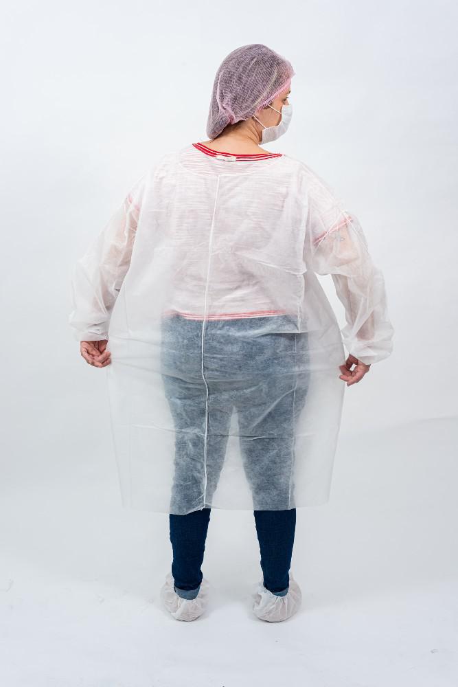 Avental confeccionado em TNT (tecido não tecido), 100% polipropileno, uso único, não estéril, protege o corpo do profissional de saúde ou do paciente contra possíveis contaminações por líquidos corpóreos ou substâncias contaminantes.