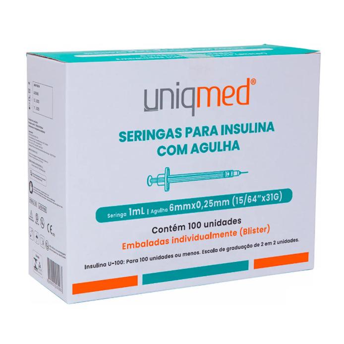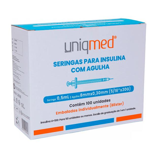 0,5 ml Seringas para Insulina Uniqmed 0.5mL Agulha 8mmx0.30mm - Caixa com 100 unidades (Blister individual)